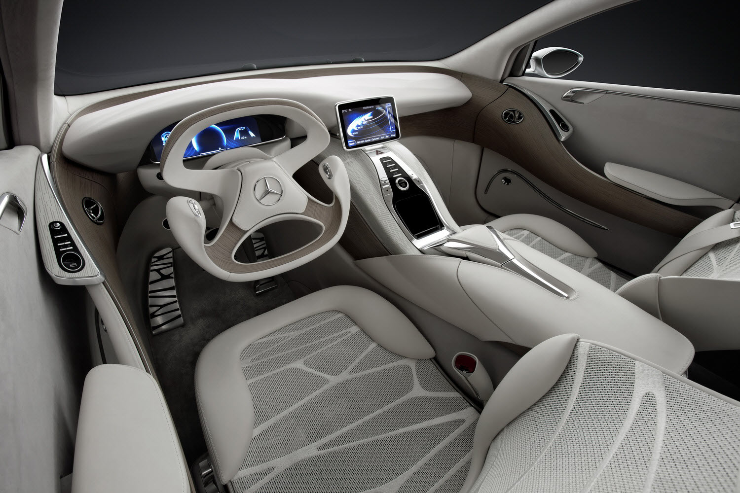 Luxurious wood surfaces and lots of light ensure a high level of comfort in the interior of the Mercedes F800 Style Concept. Occupants will immediately notice the modern sense of lightness, and functional elements like the driver area and the door armrests seem to float in space like sculptures. The innovative lightweight-construction seats in the Mercedes-Benz F800 Style Concept consist of a magnesium shell and a carbon fiber laminate shell backed with a fine yet resistant netting. The seat shell also features genuine wood veneer. For the veneer process, Mercedes-Benz engineers used a 3D surface coating procedure designed especially for the veneering of three-dimensional surfaces. This same procedure was used to create the wood finish in the center console, on the doors, and in the driver area. These wood finishing pieces are molded as 3D laminated components and are augmented by an aluminum core, which ensures that the components meet the high crash safety standards that are a hallmark of Mercedes.